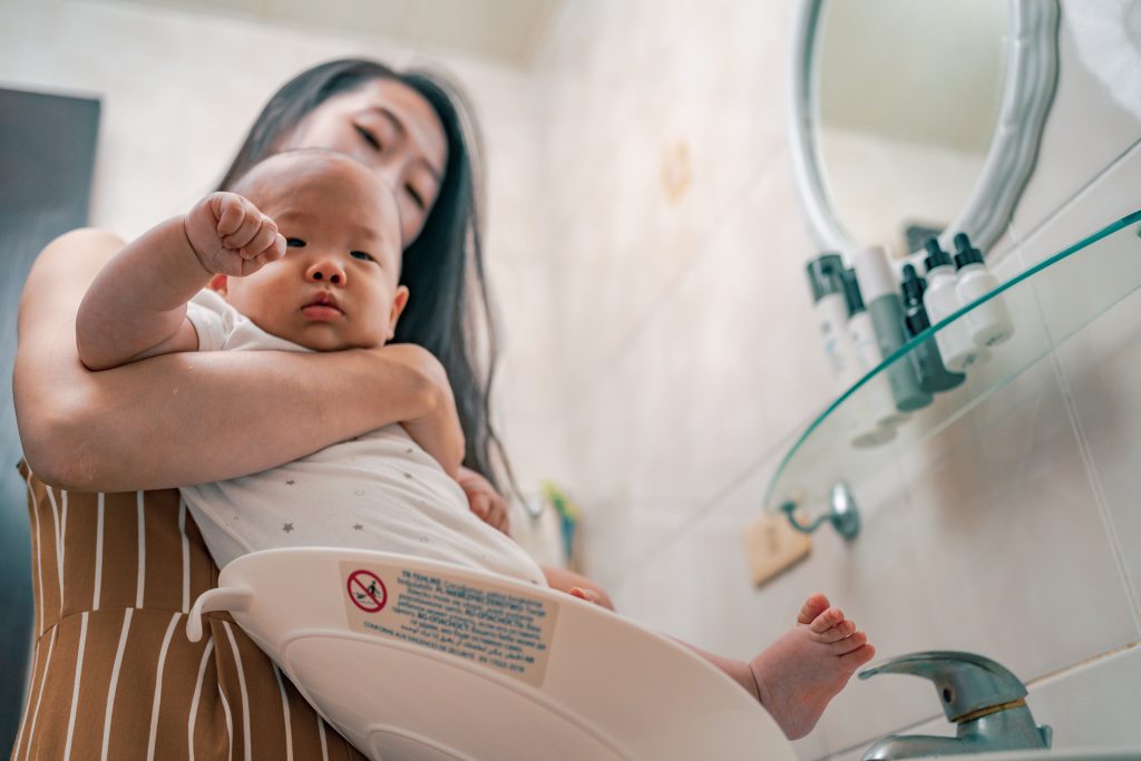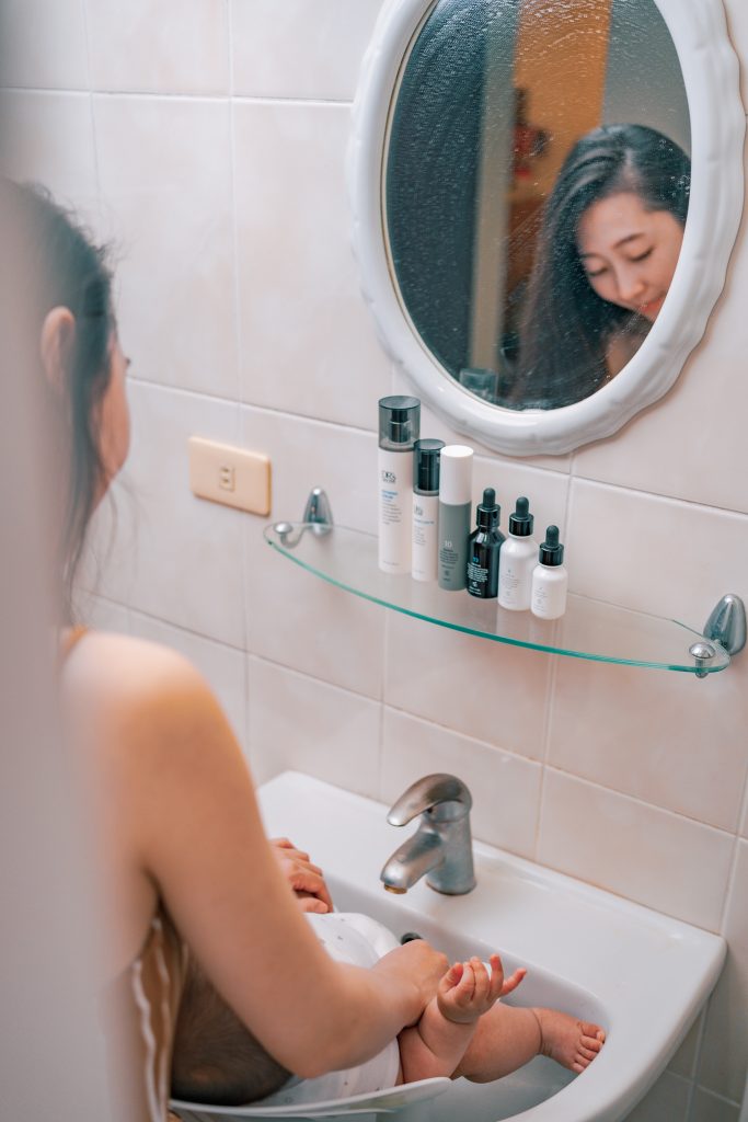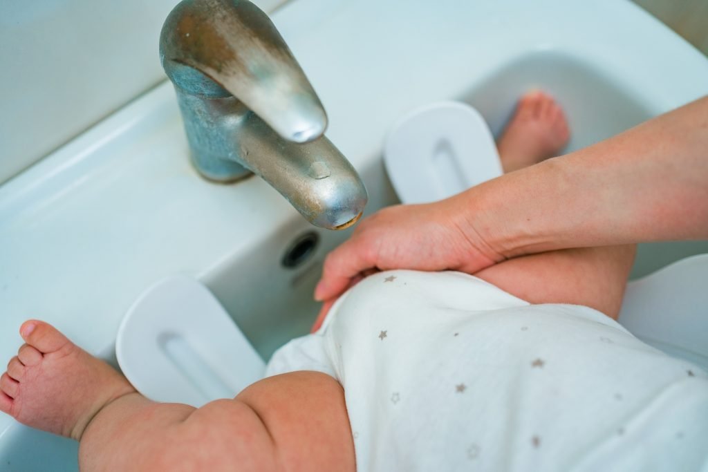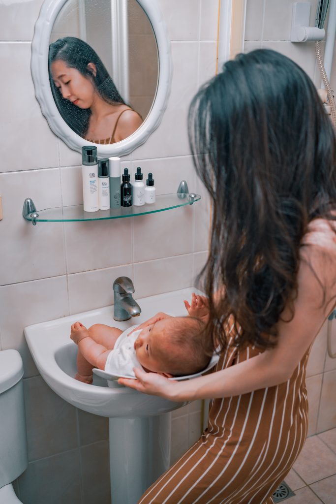 清洗的過程是家長要站在寶寶的正後方成一直線,而非站在側邊清洗,以防寶寶猛踢一腳就往後翻下洗手檯。