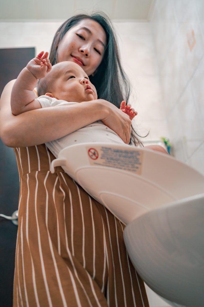 對於有在運動健身的爸爸來說,幫8公斤的在熙洗屁屁就像是輕量健身一樣簡單,但對於體重只有在熙5倍多的媽媽來說相當於爸爸要舉起14公斤的啞鈴一樣,相當吃力(或許吧?)
