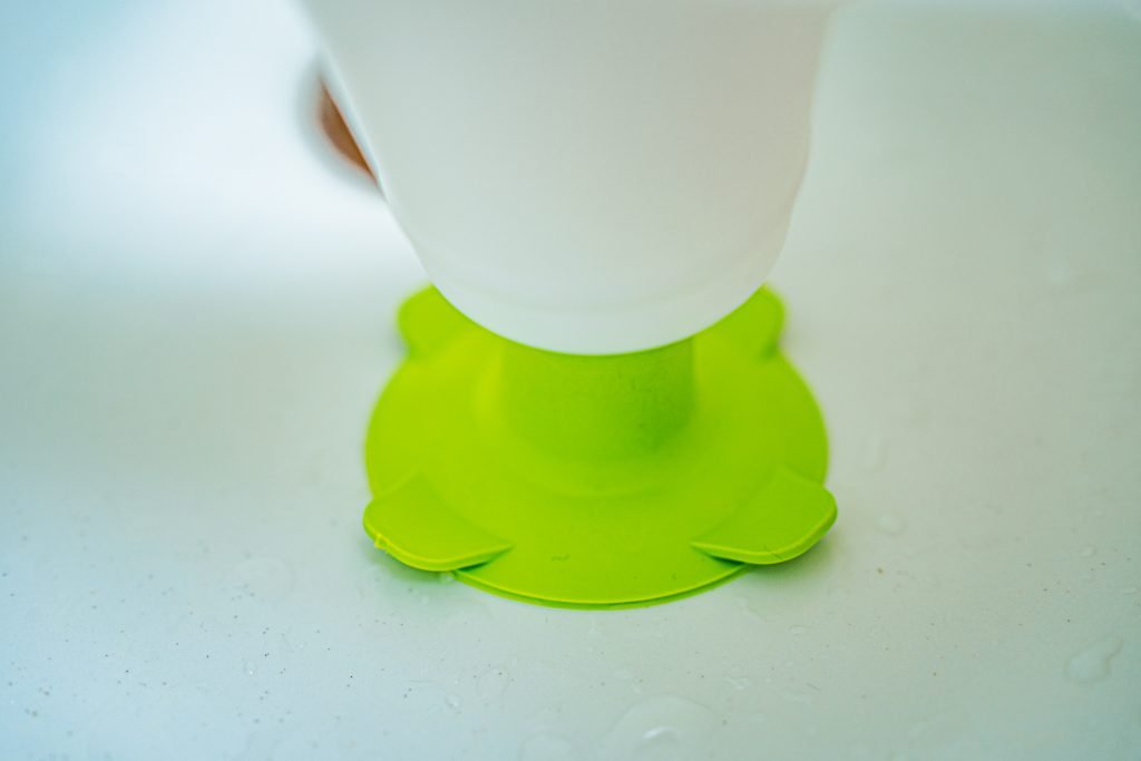 可樂椅安裝容易,透過兩個吸盤就能固定在水槽中。再將寶寶放在可樂椅上,雙腳打開將屁屁放在中間的凹處,才能好好清洗孩子的屁屁。