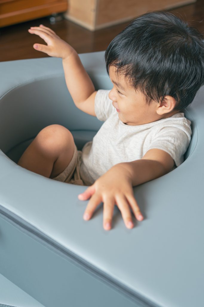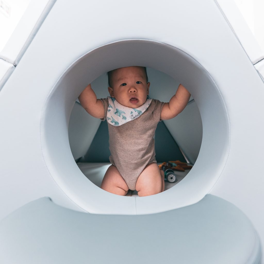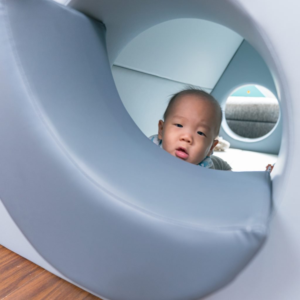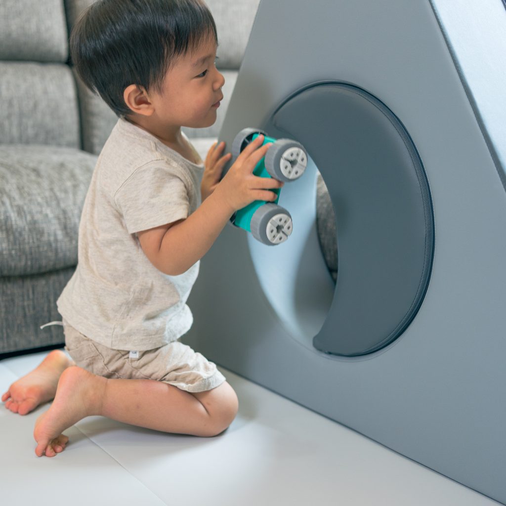 山洞的半月型抱枕可以讓孩子組裝和推開,形成出入口的概念,讓他們更能掌握自己私密空間的自主權,也是增加地墊遊玩的樂趣。