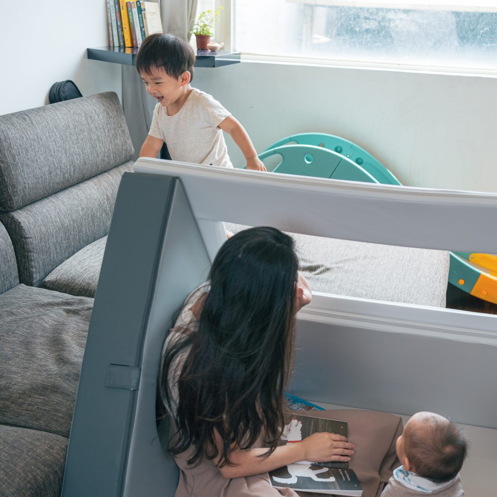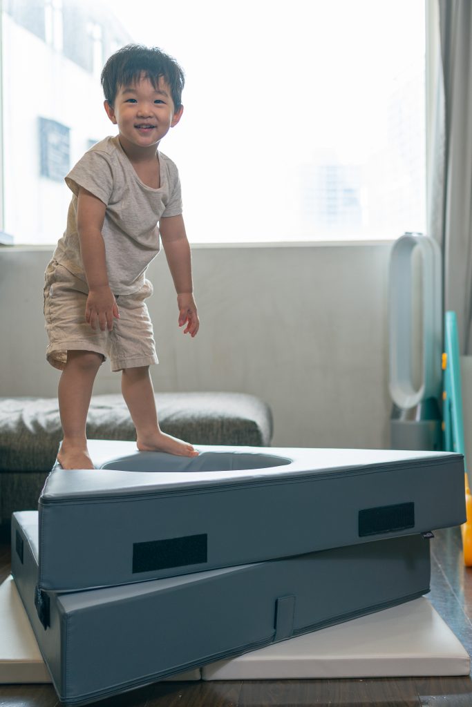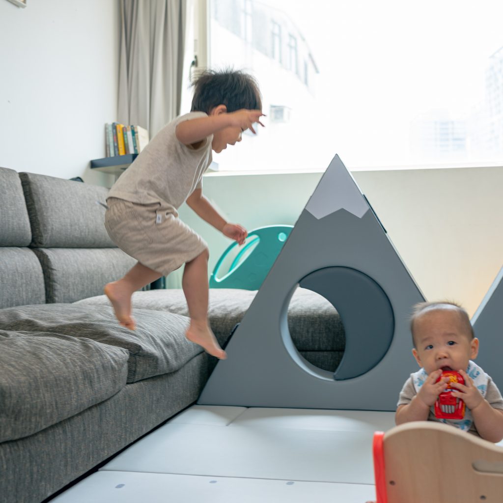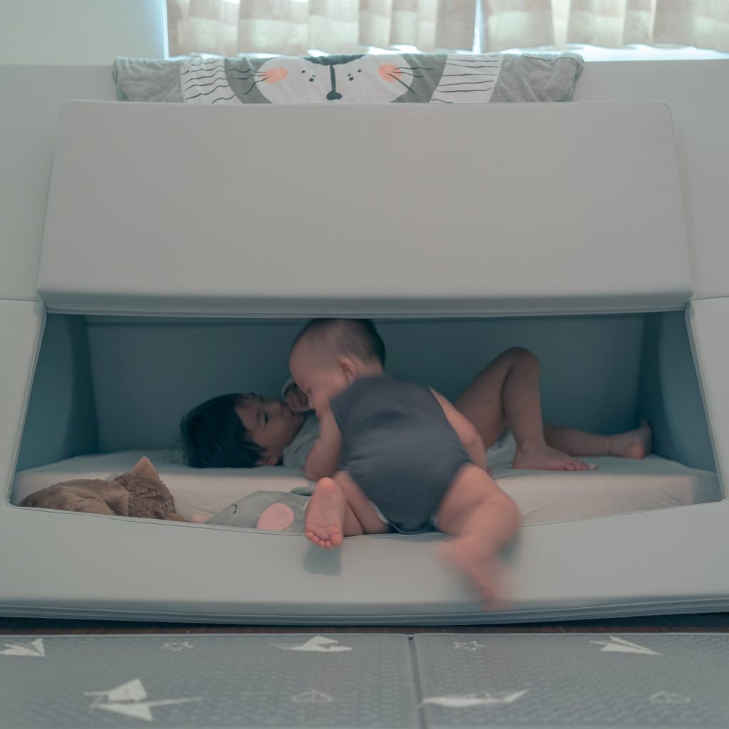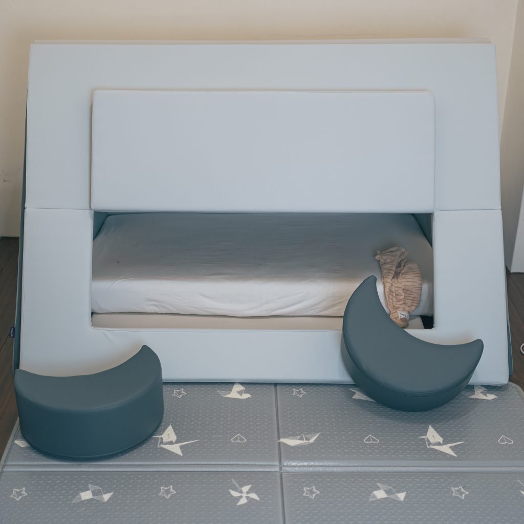 將整格山屋倒放之後,再將原本放在地上的兩折墊放上去,就形成最棒的親子空間,擁有更厚的緩衝地墊,以及親子相處的區域。