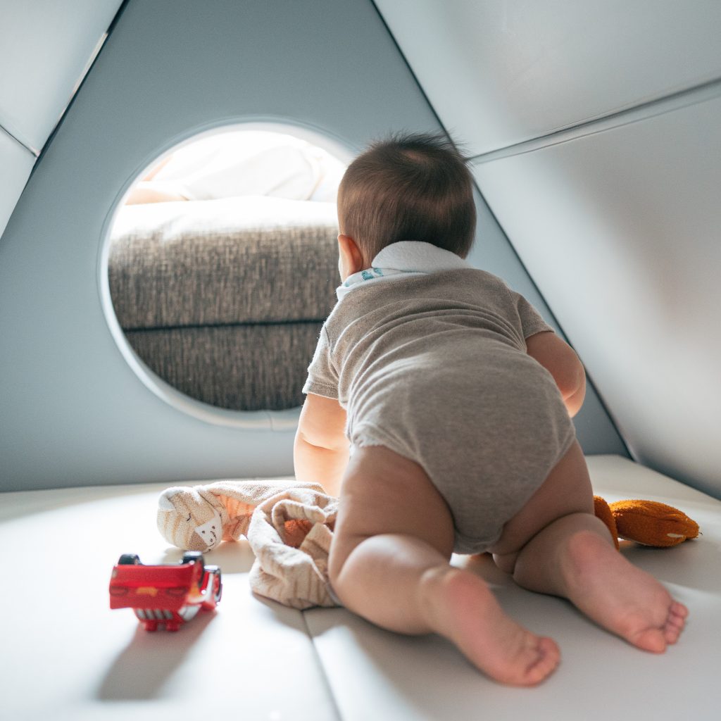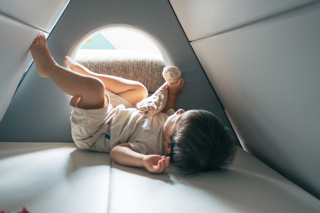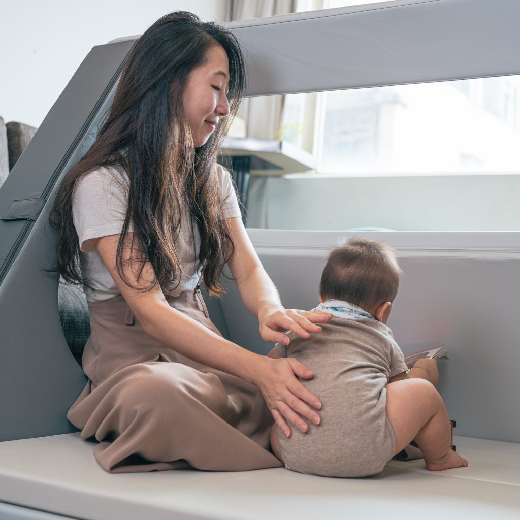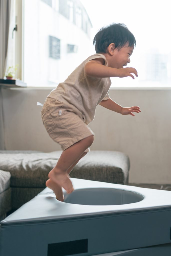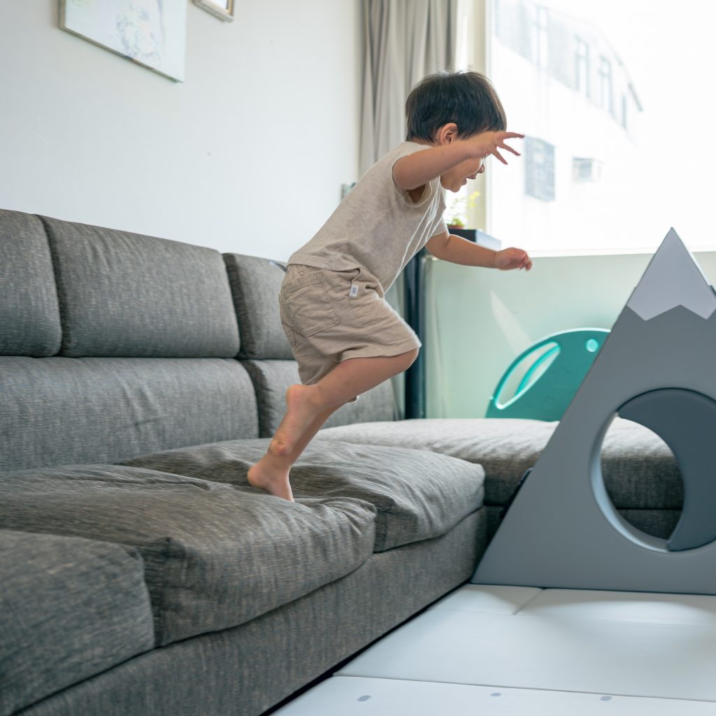 將整格山屋倒放之後,再將原本放在地上的兩折墊放上去,就形成最棒的親子空間,擁有更厚的緩衝地墊,以及親子相處的區域。