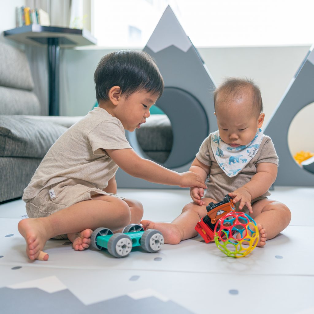 三角墊疊起來後,兩兄弟很愛在平面區域玩玩具