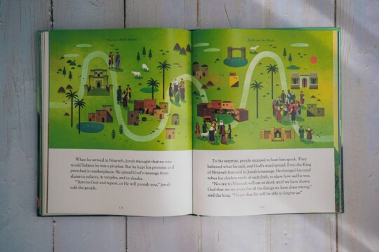 My First Bible Story 的特色是他的繪圖風格非常現代藝術且多變,因為這本書的繪圖是由七位藝術家完成的,非常適合培養STEAM教育中的A(ART 藝術)。在這本書中你可以看到不同的繪畫風格,既童趣又壯闊、既寫實又超現實、既平靜又激昂。繪本的封面也著相當精緻的手感,是加厚填充的精裝外殼,摸起來扎實卻柔軟,在閱讀體驗上相當舒服。如果想將適合兒童聖經故事分享給其他朋友,這本書絕對是最佳首選!