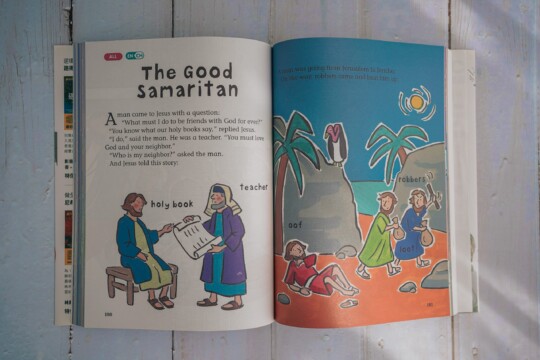 我們在早期教育的重要性文章中提到老卡爾如何訓練他的孩子學會八種語言,其中一種重要的方式就是讓孩子閱讀不同語言的同樣故事,透過對故事內容的熟悉以及不同語言的交叉比對,孩子能更容易理解另一種語言。因此建議父母至少要買中英兩種版本的兒童聖經繪本,讓孩子多多接觸不同的語言。