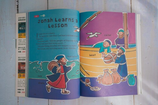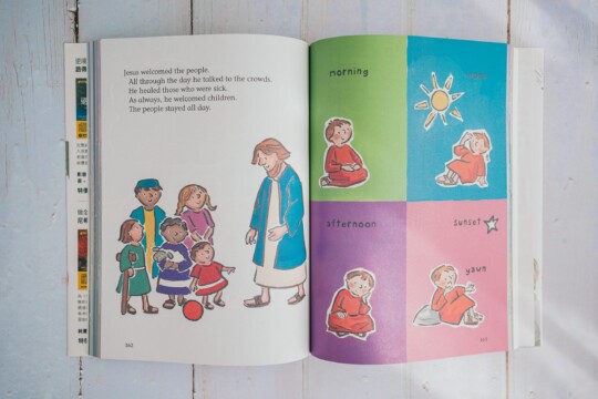 My Look and Point 圖說聖經故事是由知名的英語學習品牌Live ABC出版的兒童聖經英文學習繪本,不僅僅是學習聖經中的信仰故事,同時也能學習英文!圖說聖經故事的設計很特別且細心,除了故事內容之外,在插圖中會加入英文學習元素,例如在約拿的故事中會在船·隻上標註 Boat;在水手旁標註 Sailor;在海面上標註 Sea⋯⋯等等。或者是將故事中用到的時段做分類,如圖中的morning、noon、afternoon、sunset。