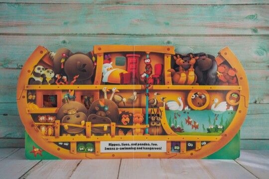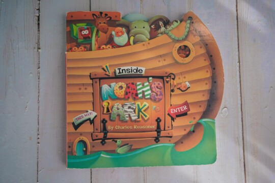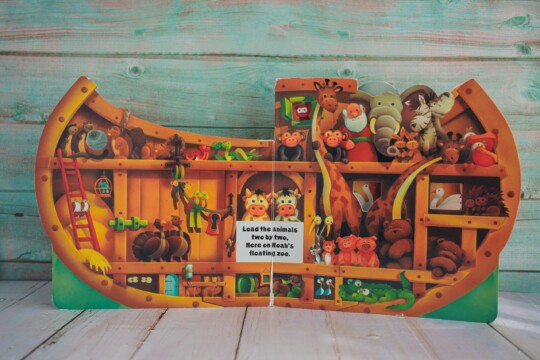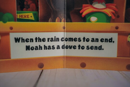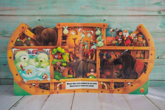 相較於前面My First Bible Story的多篇幅薄紙繪本,Inside Noah’s Ark 是硬紙書和短篇幅的設計。Inside Noah’s Ark 的內容是諾亞方舟故事,全篇含封面封底只有7頁。有趣的是這本書是視覺穿透立體設計,將書闔起來時,看起來像是諾亞方舟的船頭,打開書之後會發現,整本書竟然是諾亞方舟的剖面圖,非常適合作為兒童主日學教材!除了立體造型之外,Inside Noah’s Ark中的英文句子都有押韻,也有助於孩子學習英文。