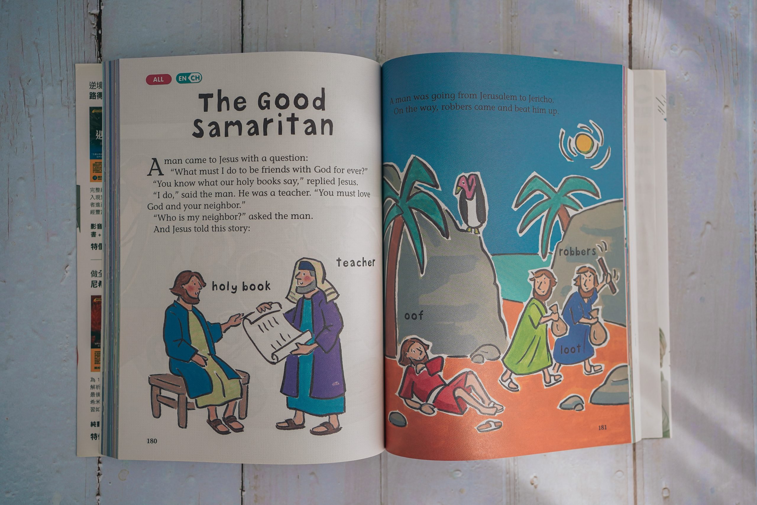 我們在早期教育的重要性文章中提到老卡爾如何訓練他的孩子學會八種語言,其中一種重要的方式就是讓孩子閱讀不同語言的同樣故事,透過對故事內容的熟悉以及不同語言的交叉比對,孩子能更容易理解另一種語言。因此建議父母至少要買中英兩種版本的兒童聖經繪本,讓孩子多多接觸不同的語言。