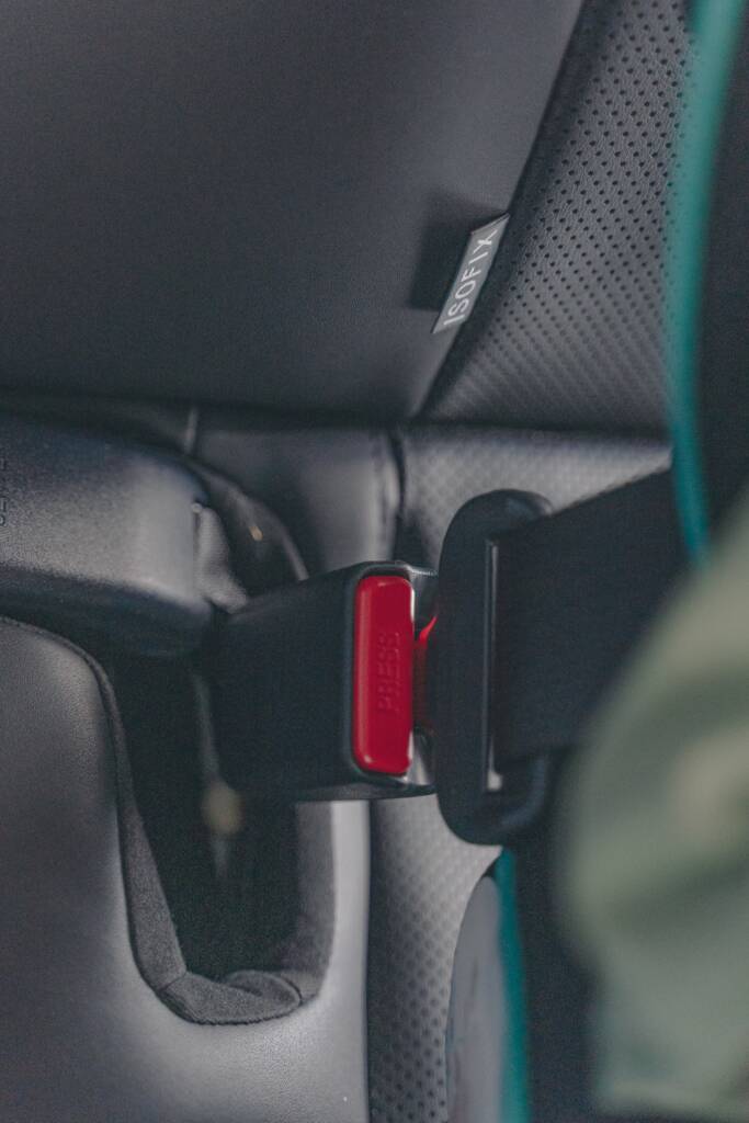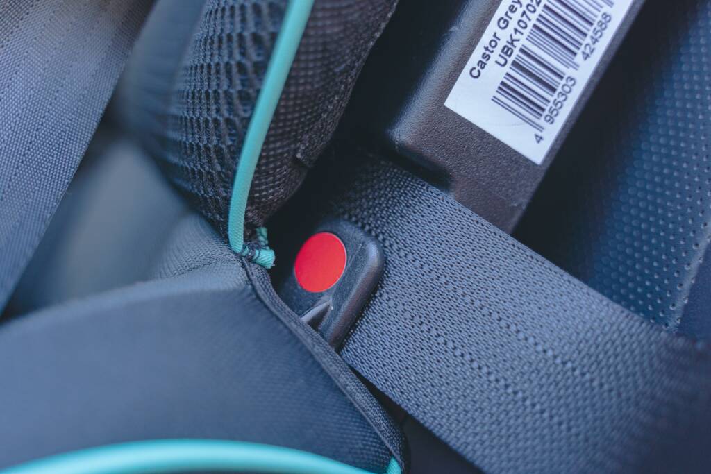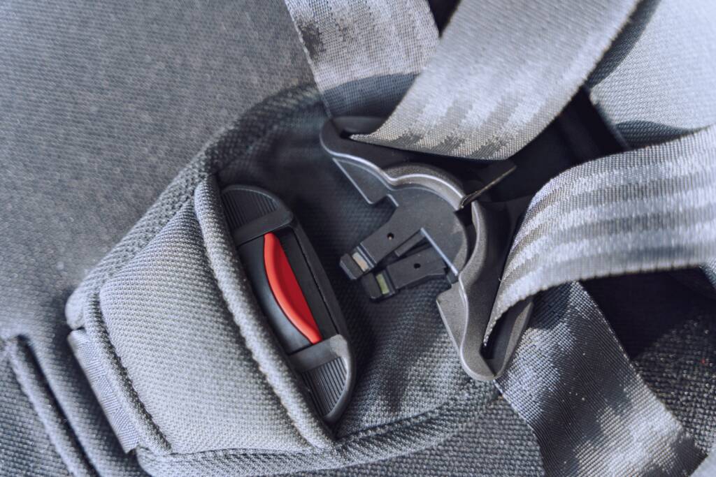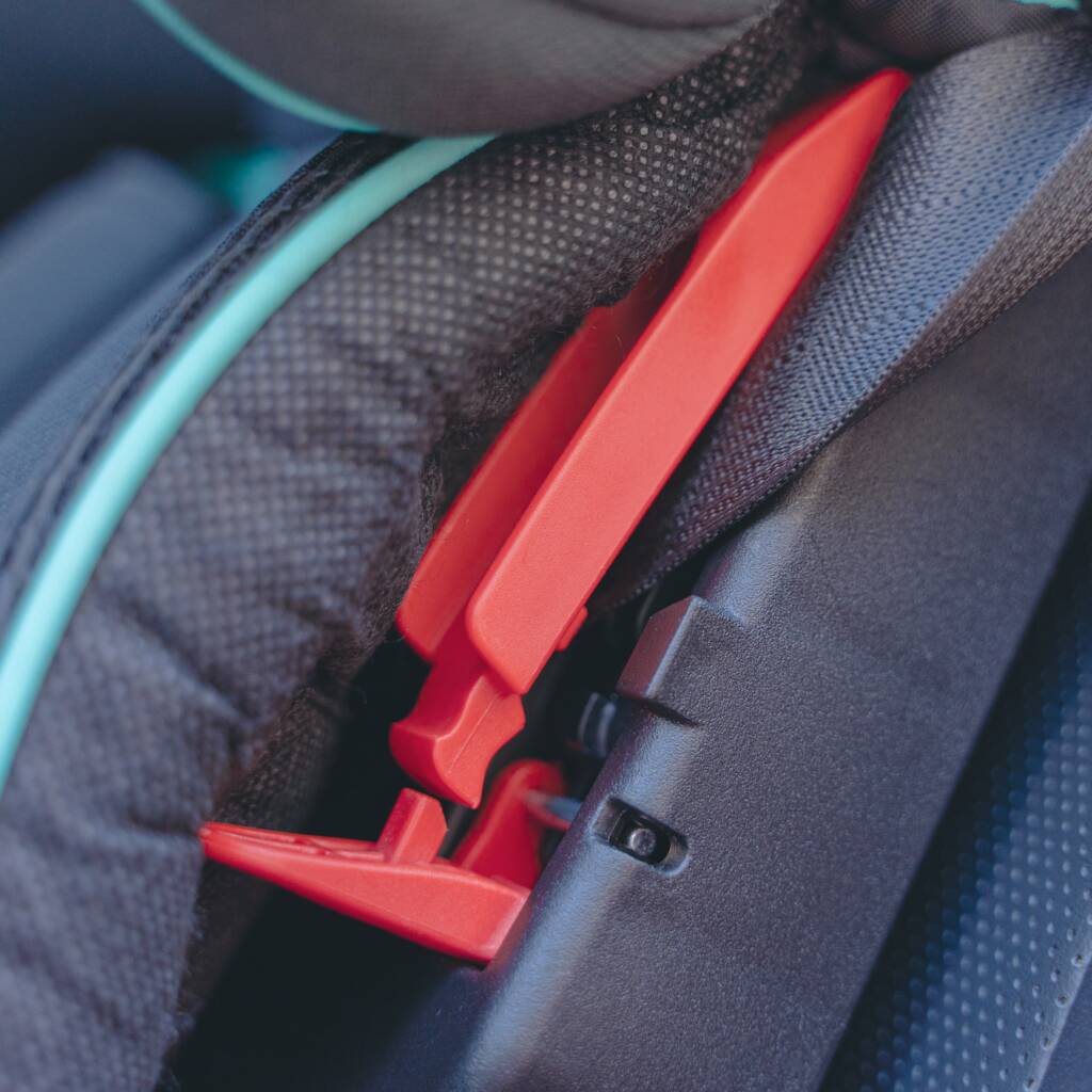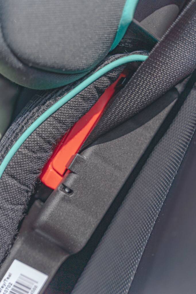 將安全帶穿過椅背,扣上安全帶扣座,再用紅色安全夾扣住,輕鬆變完成安全汽座的安裝了。