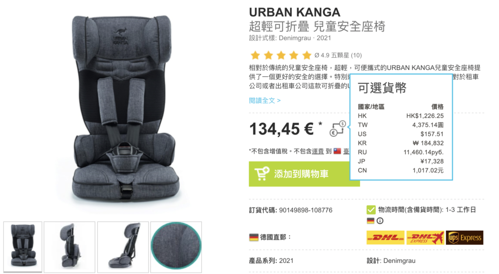 Urban Kanga目前在台灣沒有通路,只能透過德國母嬰網站 Kidsroom 直送過來。歐元售價為134.45 €,合台幣約4,375,最便宜的DHL運送方案約 37.44 €,合台幣約為1,220,相加起來約台幣5,600。