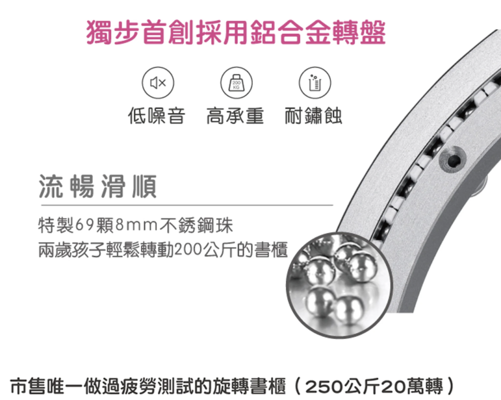 首創的鋁合金轉盤設計讓旋轉書櫃具備「低噪音、高乘重、耐腐蝕」,讓孩子輕輕鬆鬆就可以轉動將近200公斤的書櫃,每層耐重48公斤,最高可放4層。