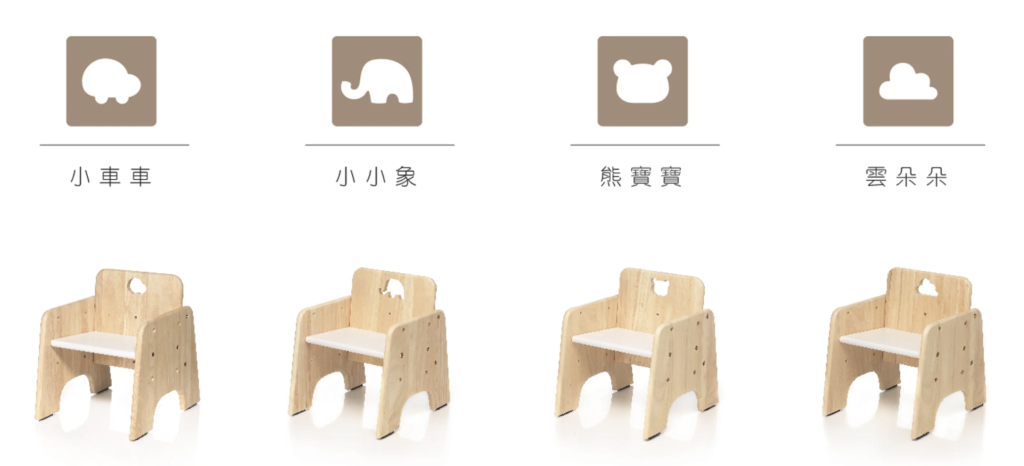成長椅共有四款椅背設計:小車車、小象象、熊寶寶、雲朵朵