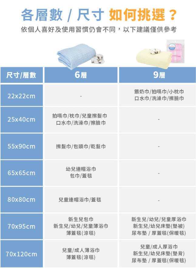 我們家最常使用的就是9層紗22*22,小時候拿來當餵奶時的口水巾,長大後孩子生病就拿來擦鼻涕,或是洗澡、洗臉時使用都很適合。另外就是6層紗70*95拿來當孩子的浴巾。