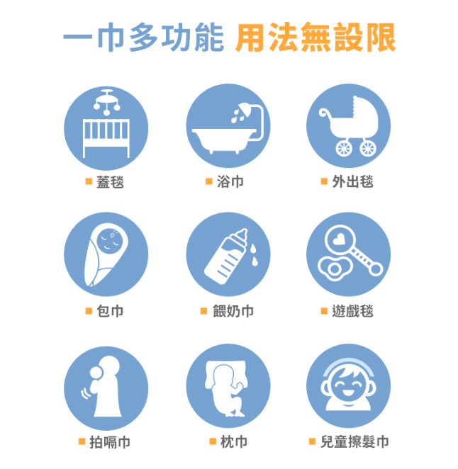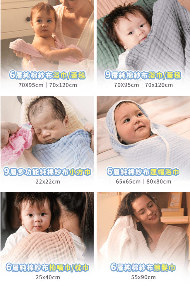 如果是2歲以上,我也很推薦有6層紗22*40(當洗澡巾)、6層紗70*95(當浴巾用)、9層紗70*120(當小棉被)