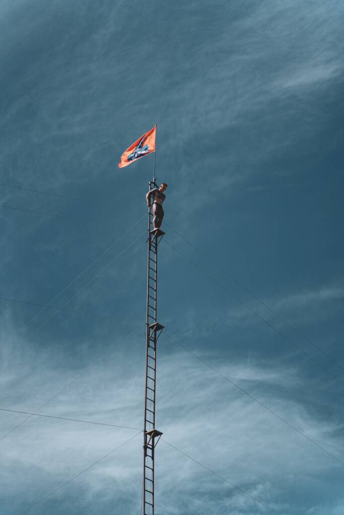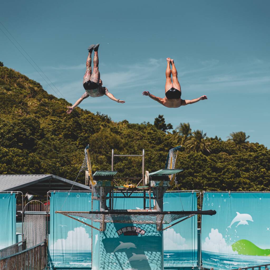 開胃菜表演結束之後,就開始進入到高空跳水的表演,跳水員會一層一層地爬上再跳下,一直爬到最高點,沒記錯的話有十層樓高⋯⋯小朋友請勿模仿。