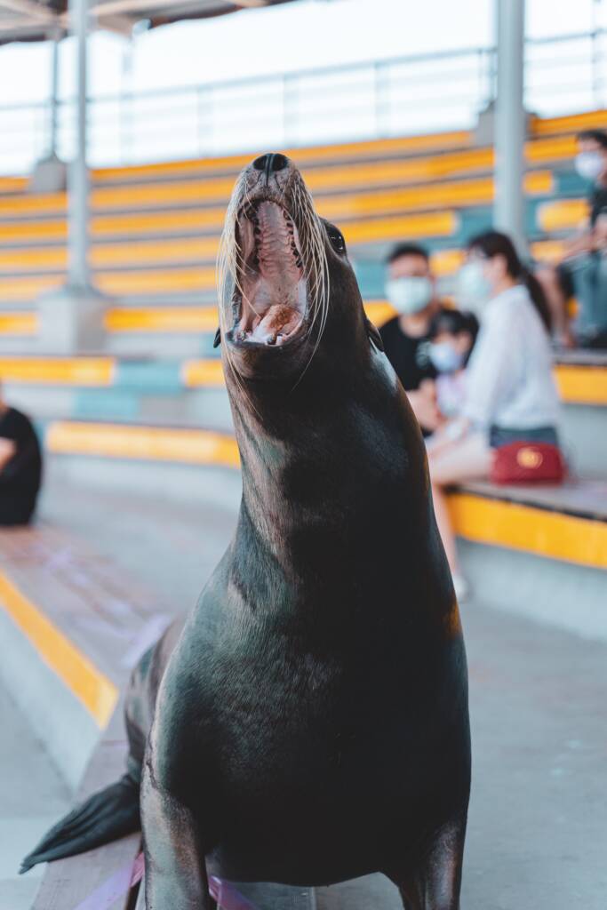 可以近距離看到海獅的毛皮、小耳朵還有鬍鬚,更可愛的是海獅還會張嘴讓你看牠的牙齒,主持人也會介紹為什麼海獅的牙齒是黑色的。