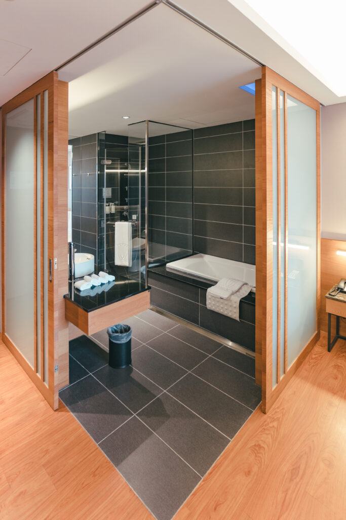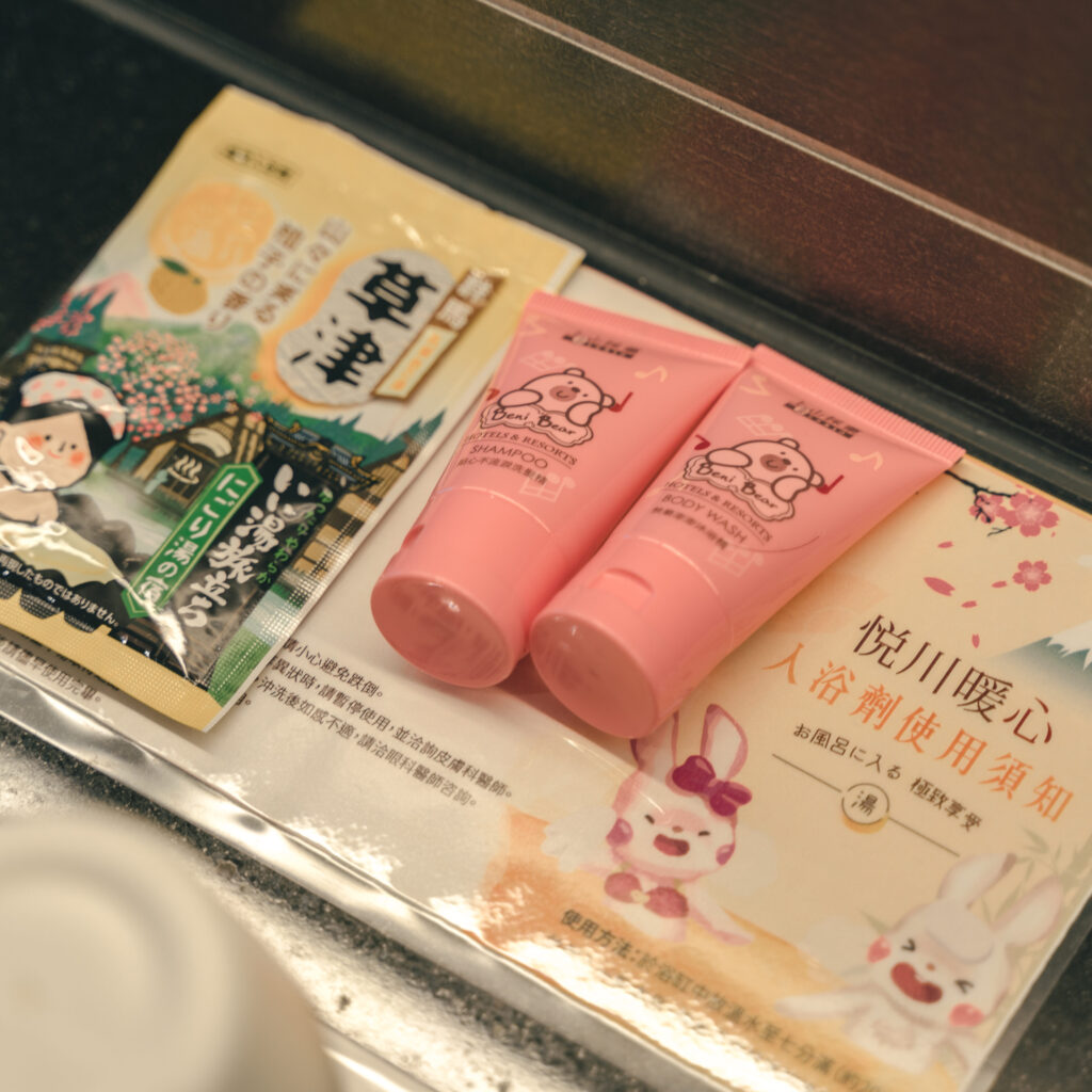 浴室設計為雙開拉門,每個房型都有浴缸(但非溫泉浴池),浴室整潔度很不錯,沒有老舊、班黃或黴菌,唯一要小心的就是乾濕分離的蓮蓬頭設計需要摸索一下,沒調好會被水柱攻擊。