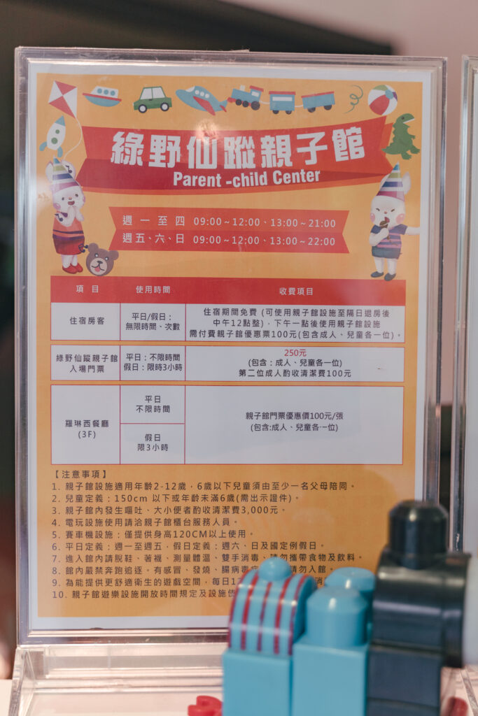 我們當天是下午2點到飯店,先入房放行李,簡單整理一下,14:30就開始讓孩子奔走亂玩2小時,離開飯店覓食,晚上19:30繼續玩到關門,隔天一早早餐結束繼續玩到11點退房就往宜蘭親子農場出發。