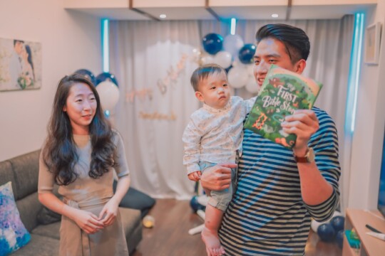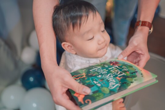 大家常說第一胎照書養,所以一開始我讀了許多養育與教養的書籍(懷孕期間大概讀了30本以上吧!!!),裡面最讓我印象深刻的便是《猶太媽媽這樣教思考》書中,第一篇「吻甜書」儀式——讓孩子愛上書,體驗閱讀的美好。書中提到他們會在孩子比較有認知的時候(大約2歲)進行這個儀式,讓孩子透過舔滴在書上的蜂蜜,讓孩子間接認為書是甜的、是美好的,不用將知識死記硬背在腦袋裡,而是先愛上書、熱愛閱讀,自然也會喜愛書中的知識。而我們想給Zion的祝福就是他能認識上帝,能知道這信仰的美好,所以在周歲派對上我們將他的兒童聖經故事書《My First Bible Story》滴上蜂蜜,讓他舔書上的蜂蜜,使他從小就能知道一切的美好祝福來自於愛他的天父。